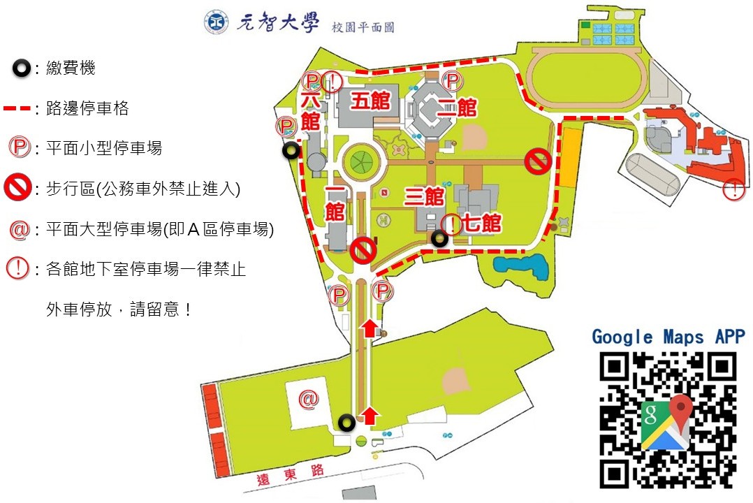 - 請按照規定停放於停車格內,如因違反校內停車規定遭鎖車者(如駛入步行區或停放至紅線、各館出入口或造成交通阻礙),請依本校總務處相關罰款規定,繳清後始得解鎖離校,請學員留意!!